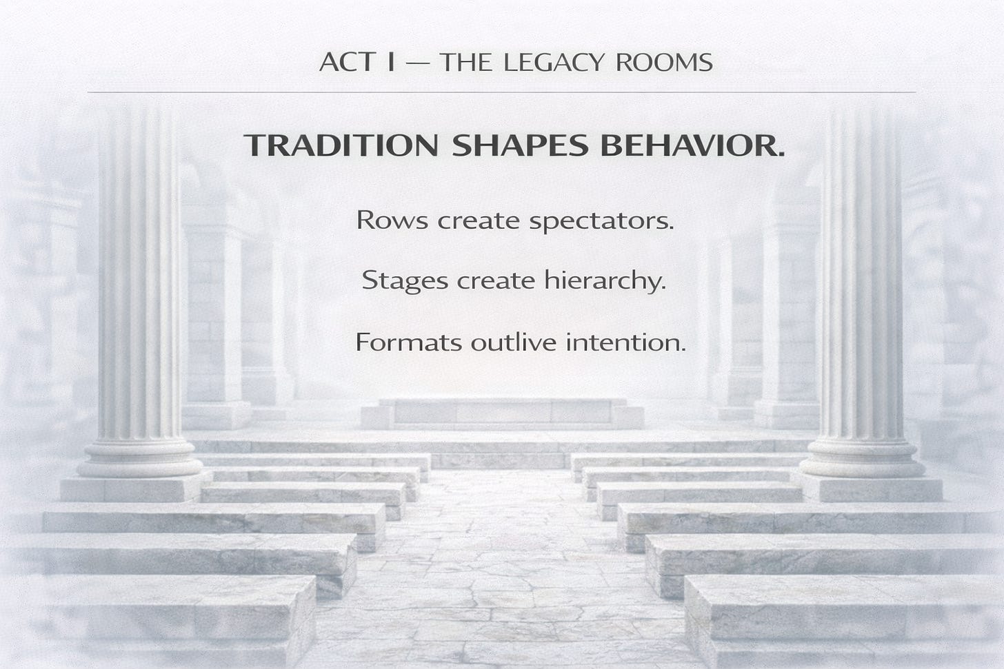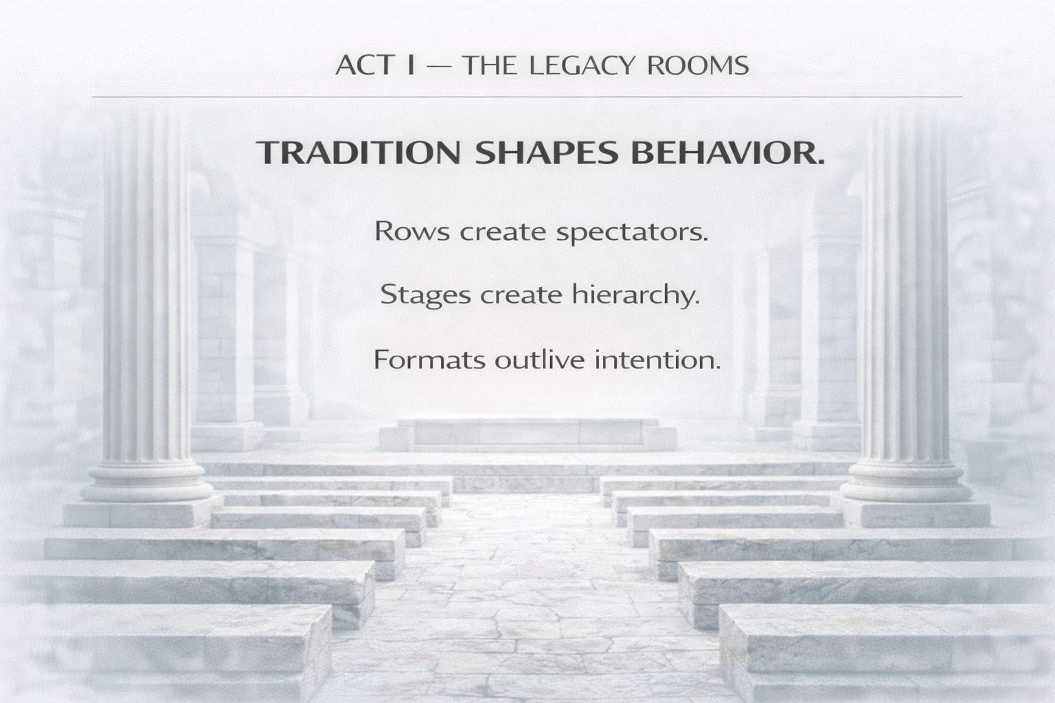 Form: A raised platform washed in light, endless chairs facing forward, air thick with expectation.