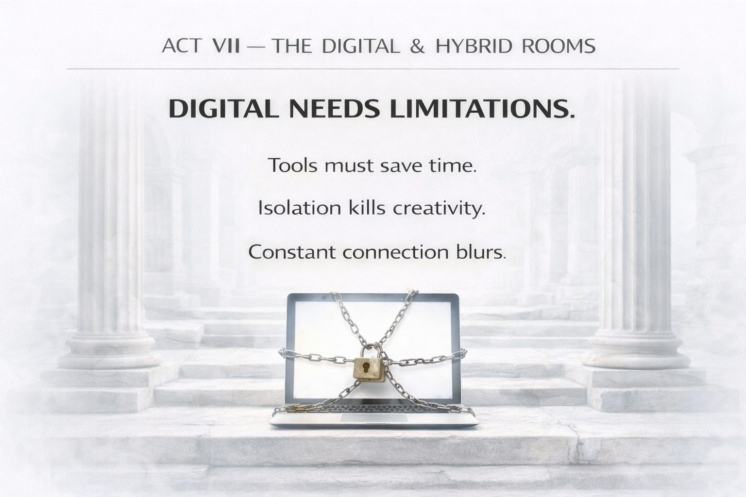 The challenge isn’t access—it’s presence. Our brains crave micro-signals — blink, breath, tone — and good digital rooms fake none of them.