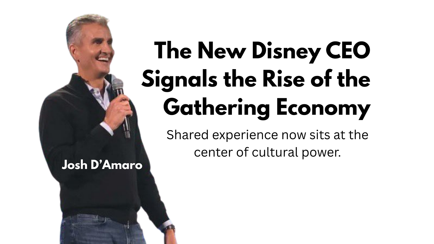 I want to be explicit about why I’m stopping to mark this moment, because this is not a reaction to a press release and it’s certainly not a piece of Disney fandom dressed up as analysis. I’m calling this out because I’ve spent years arguing that the Gathering Economy and what I call the convening class are not secondary players orbiting media, technology, or marketing, but central actors in how culture, trust, and meaning are formed. When The Walt Disney Company named Josh D’Amaro as its chief executive, it didn’t validate that idea rhetorically. It validated it structurally, by handing the company to someone whose entire professional life has been shaped by participation rather than projection.