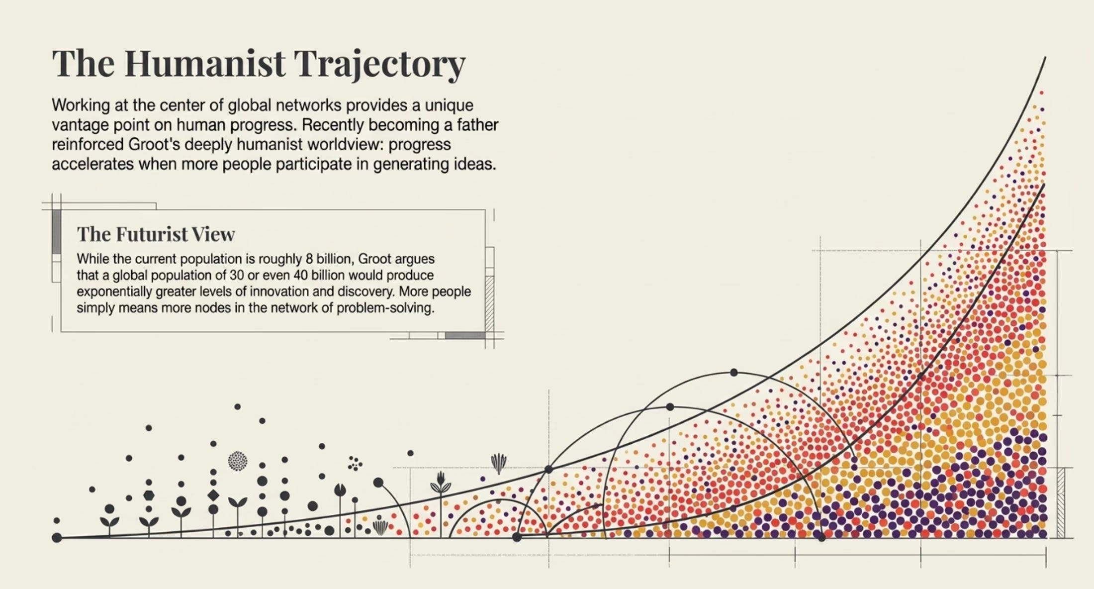 Near the end of our conversation he mentioned something else that had recently changed in his life. Six weeks earlier he had become a father. Holding a newborn tends to reshape how people think about the future, and in Groot’s case it reinforced a worldview he already held about humanity’s trajectory. He describes himself as a humanist who believes progress accelerates when more people participate in generating ideas and solving problems. When asked how large the global population should become by the end of the century, he offered an answer that surprised me. While the current population sits just above eight billion, he believes a world with thirty or even forty billion people could produce far greater levels of innovation and discovery.