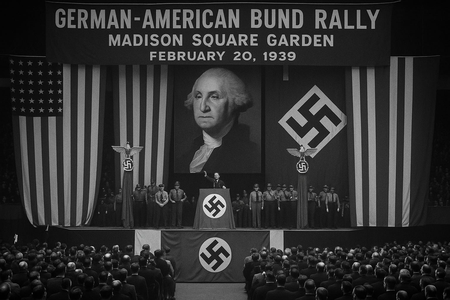 The Promise: A “pro-American” rally at Madison Square Garden hosted by the German-American Bund, aiming to normalize Nazi ideology with patriotic framing, including giant George Washington visuals flanked by swastikas.