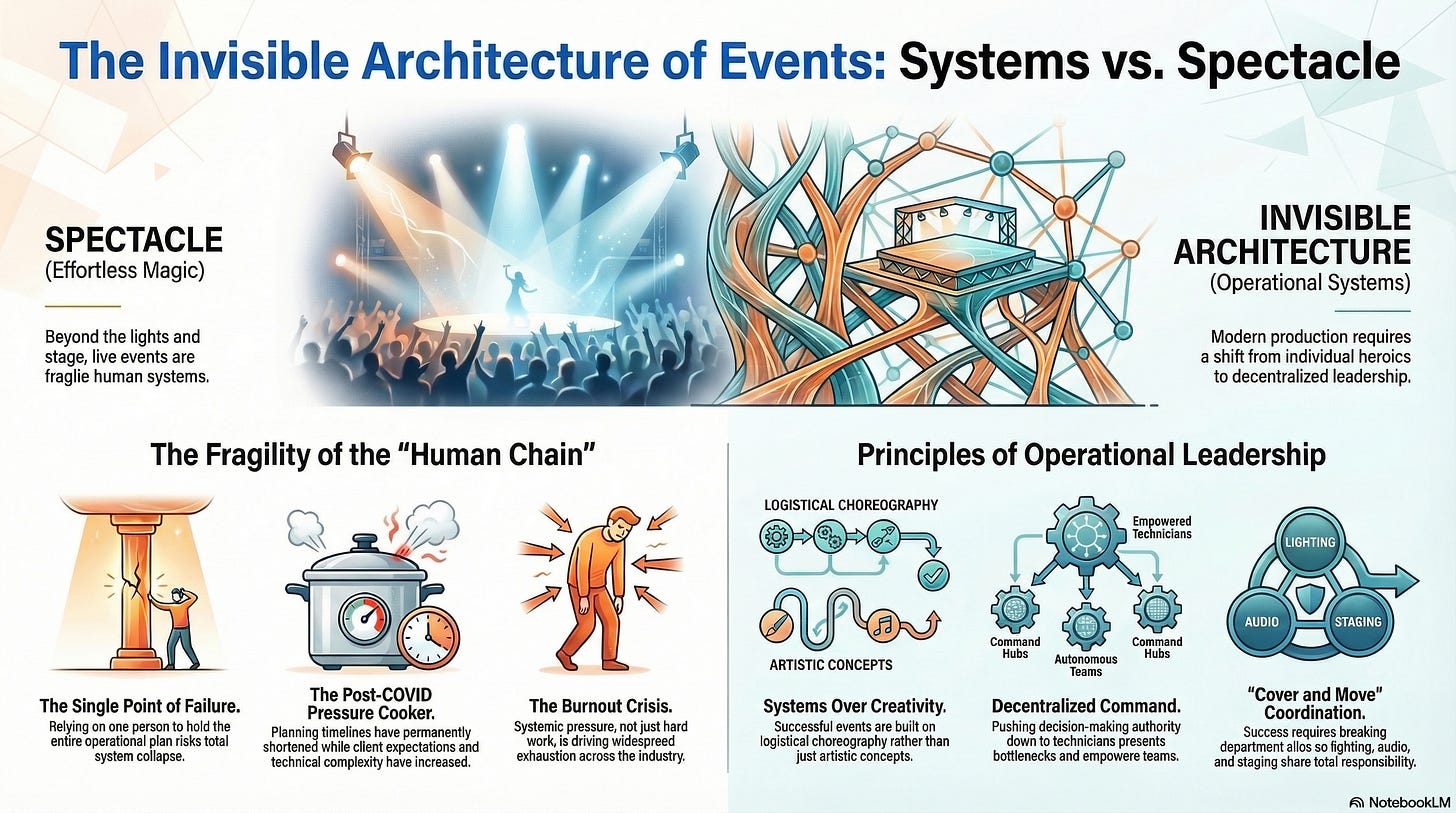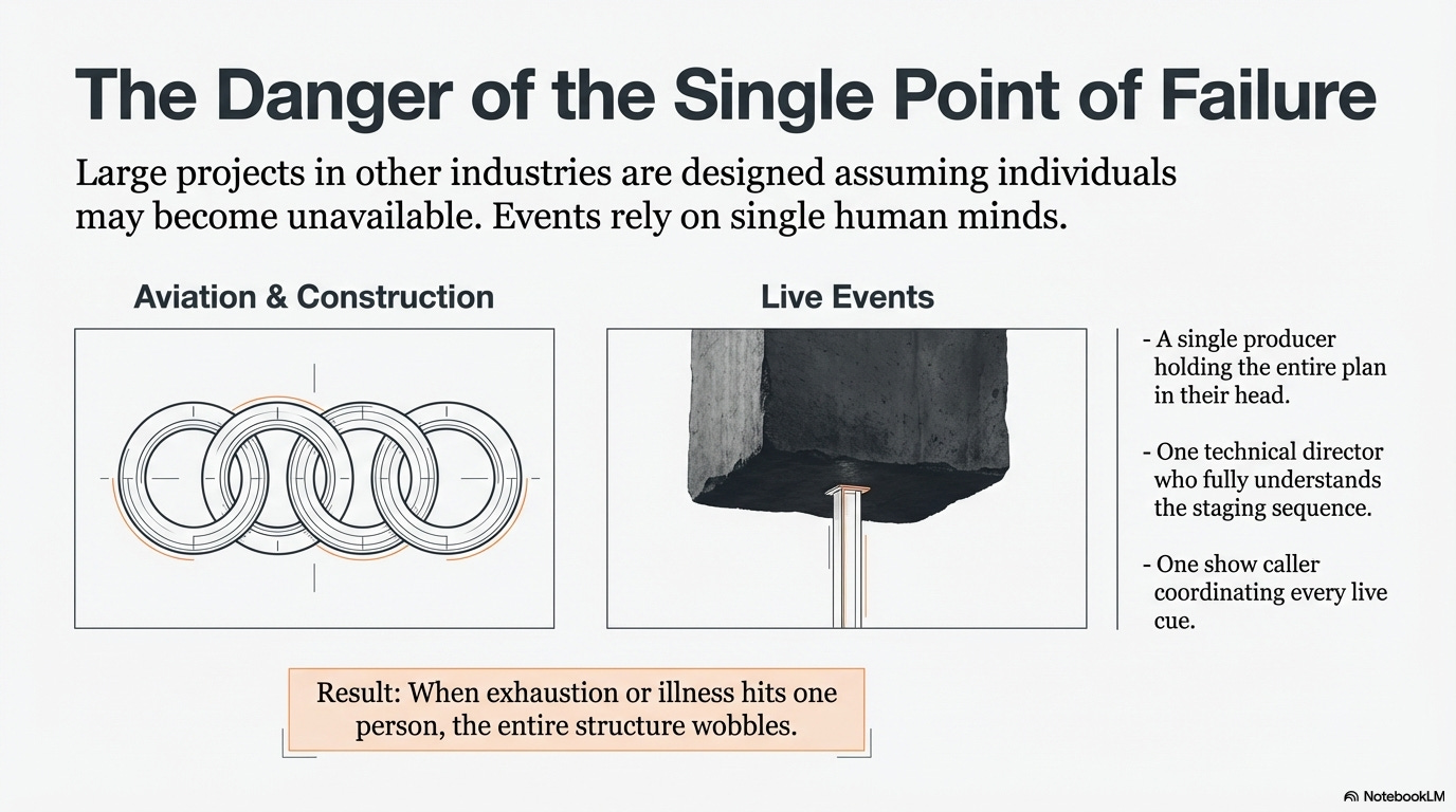 During our conversation Morrison returns repeatedly to a phrase that captures what he sees as one of the industry’s most dangerous habits. “Events rely on single points of failure in the human chain,” he says. In industries such as construction or aviation, large projects are designed with redundancy. Systems assume individuals may become unavailable and ensure others can step in. Live events often operate differently. A single producer may hold the entire operational plan in their head. A technical director may be the only person who fully understands the staging sequence. A show caller might coordinate every cue during a performance. When one of those people becomes unavailable—through illness, exhaustion, or simple error—the entire structure can wobble.