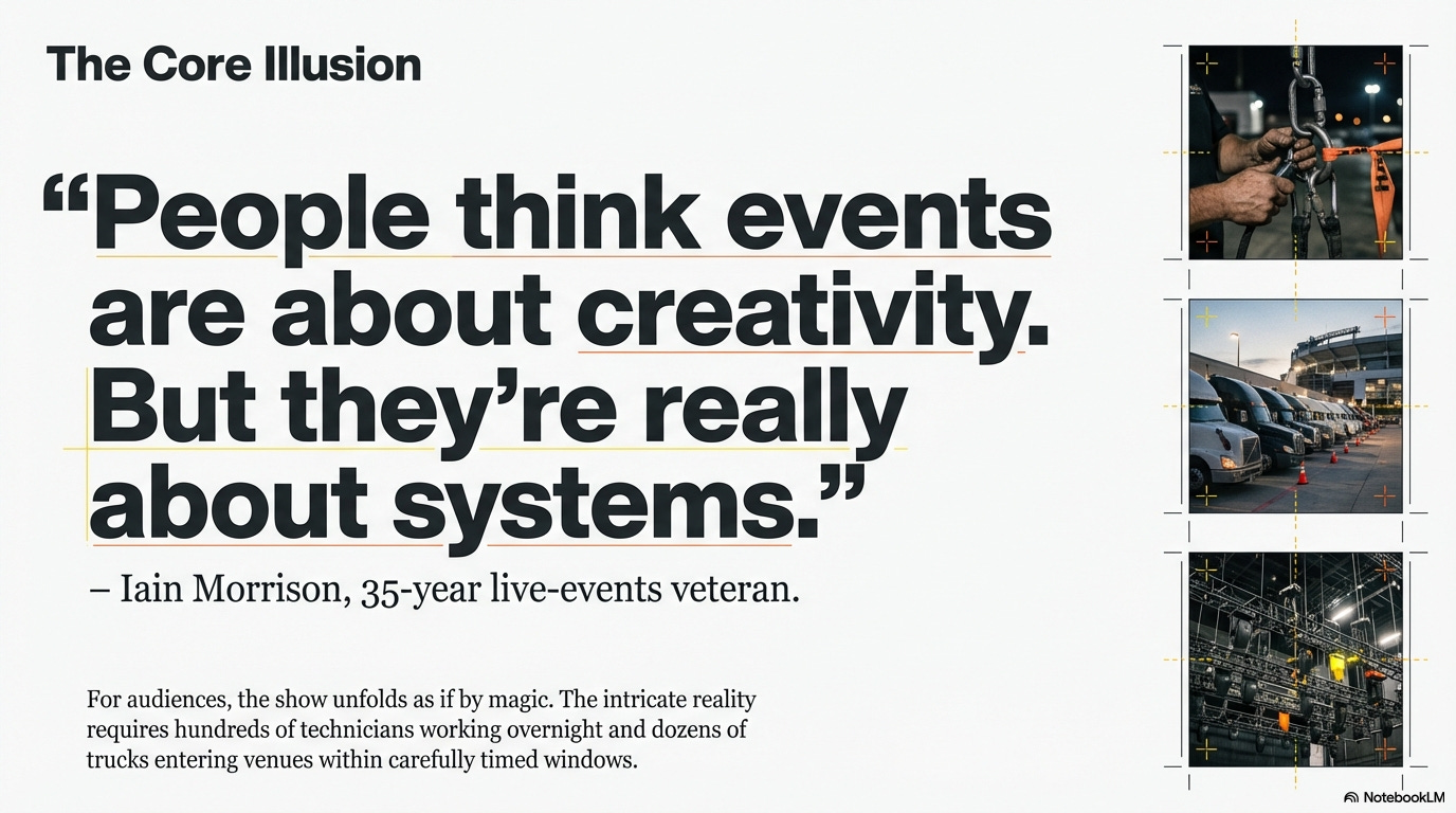 After thirty-five years behind the scenes, Morrison still believes the magic of events lies not in the spectacle audiences see but in the invisible architecture that makes the spectacle possible. When those systems function well the audience never notices them at all, which, in Morrison’s view, is precisely how it should be.