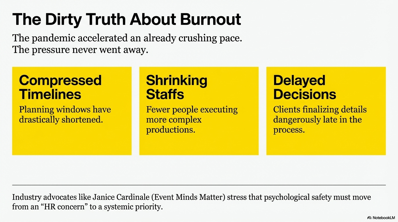 Morrison is quick to point out that he is not the only voice pushing the industry to confront these issues. Advocates such as Janice Cardinale and the Event Minds Matter initiative have been working to bring mental health and psychological safety into the center of the industry’s leadership conversation. Cardinale argues that the events ecosystem must move beyond treating mental health as an HR concern and instead address the systemic pressures that create stress in the first place. Emotional intelligence and psychological awareness, she believes, are not traits people simply possess; they are skills that must be learned and practiced if organizations expect their teams to function sustainably.