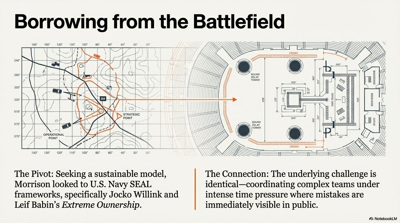 Seeking a clearer framework for leadership, Morrison began studying models outside the events industry, eventually finding inspiration in the operational principles used by U.S. Navy SEAL teams, particularly those described in Jocko Willink and Leif Babin’s book Extreme Ownership. The comparison might seem dramatic, but the underlying challenge—coordinating complex teams under pressure where mistakes are immediately visible—felt surprisingly relevant to someone responsible for large live productions. The SEAL framework emphasizes decentralized command, pushing decision-making authority down through the team so responsibility does not rest on a single individual. In practice that means technicians arrive with solutions rather than problems and departments work together rather than operating as isolated units.