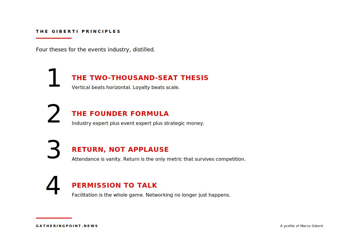 And he believes the next generation of event entrepreneurs is going to come not from the events industry at all, but from the industries events serve. The tech founder who knows everyone in the vertical, who decides a show needs to exist, and who partners with an operator who knows how to actually build it. The person on stage at the Business of Events Masterclass who Giberti is arguing should exist. The person EVG was funded to back.
