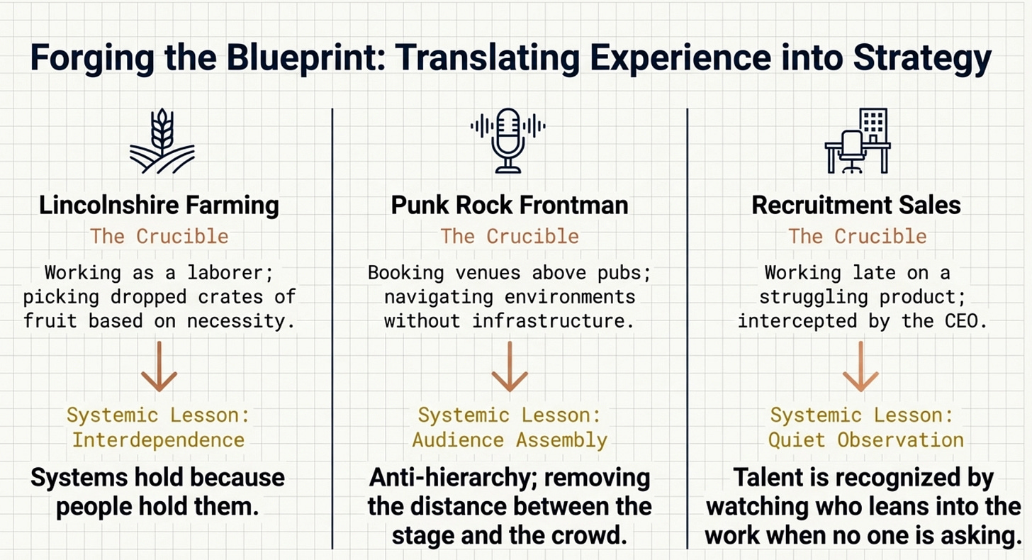 That early exposure to interdependence was reinforced in other ways. During his college years, he worked in a pet food factory alongside miners displaced during the Thatcher era, men who brought with them a sense of camaraderie forged under pressure. The work was difficult, often unpleasant, but it carried the same lesson: systems hold because people hold them, and people hold them because they understand what is at stake. He was the first in his family to go to university, navigating a transition into environments shaped by different expectations and signals, surrounded by peers from more affluent backgrounds and carrying a version of imposter syndrome that did not disappear but became something he learned to manage. What shifted that dynamic was not academic success but something less expected: his time as the singer in a punk rock band, booking venues above pubs, negotiating with skeptical landlords, assembling audiences without infrastructure. The ethos of that world—that no one is inherently better than you—provided a counterweight to the hierarchies he was encountering elsewhere.