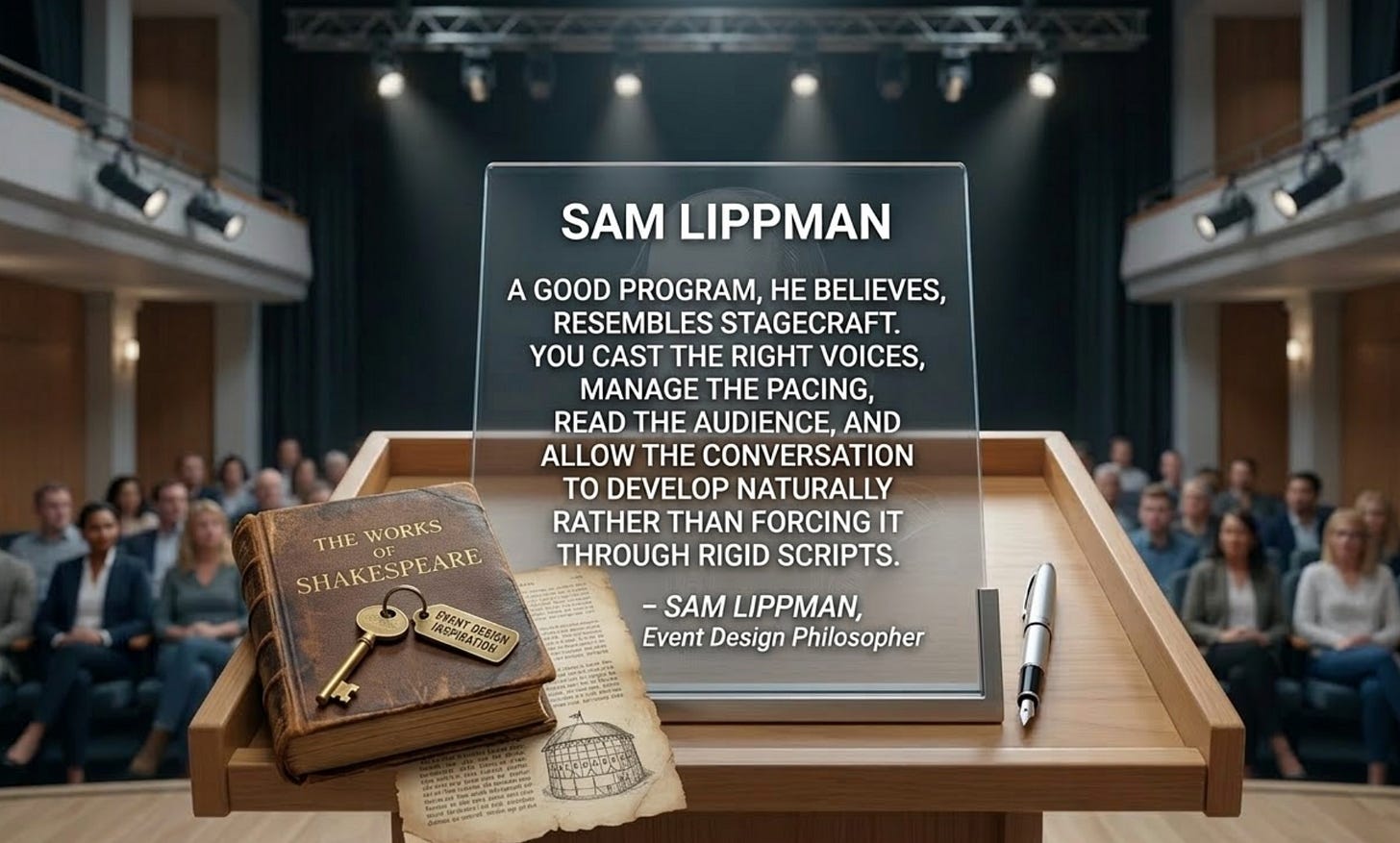 Lippman often describes event design in the language he first encountered studying Shakespeare. A good program, he believes, resembles stagecraft. You cast the right voices, manage the pacing, read the audience, and allow the conversation to develop naturally rather than forcing it through rigid scripts.