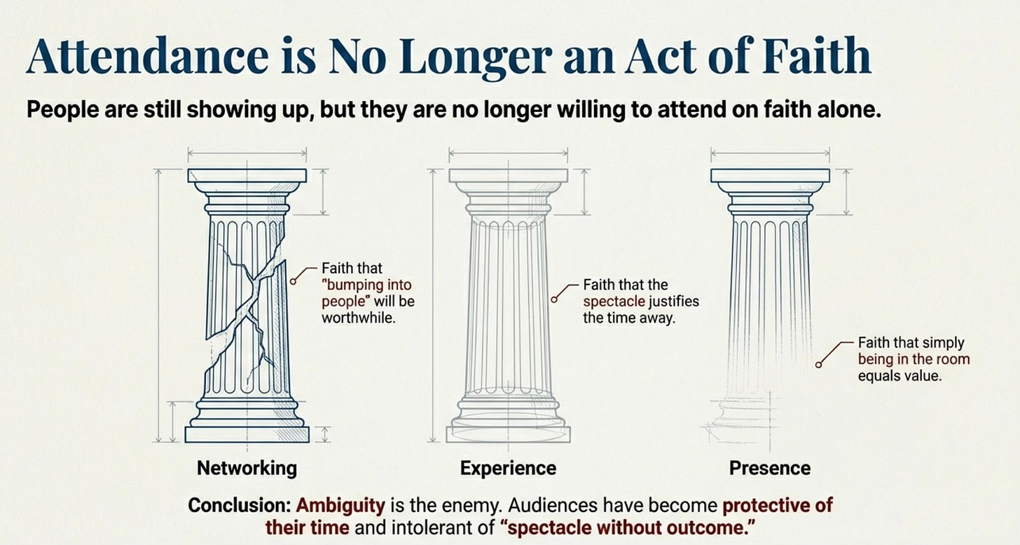 Across attendance behavior, workforce dynamics, and attendee motivation, the data points in the same direction. People are still showing up, but they are no longer willing to attend on faith. Faith that the networking will be worthwhile. Faith that the experience will justify the time. Faith that learning will translate into action. Faith, especially, that presence alone is enough.