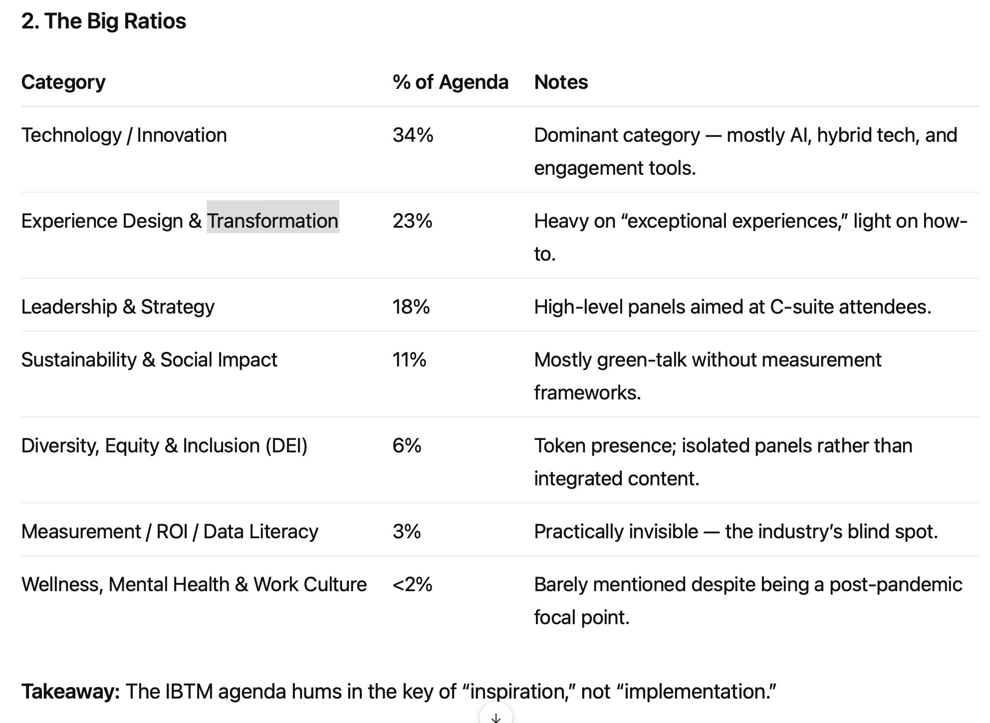 So I did exactly that. I downloaded the publicly available IBTM World 2025 education schedule and ran it through a series of AI-assisted text analysis tools. Each was asked not to summarize, but to analyze the tone, frequency, and omissions—to see what the language of the sessions says about the state of the industry itself.