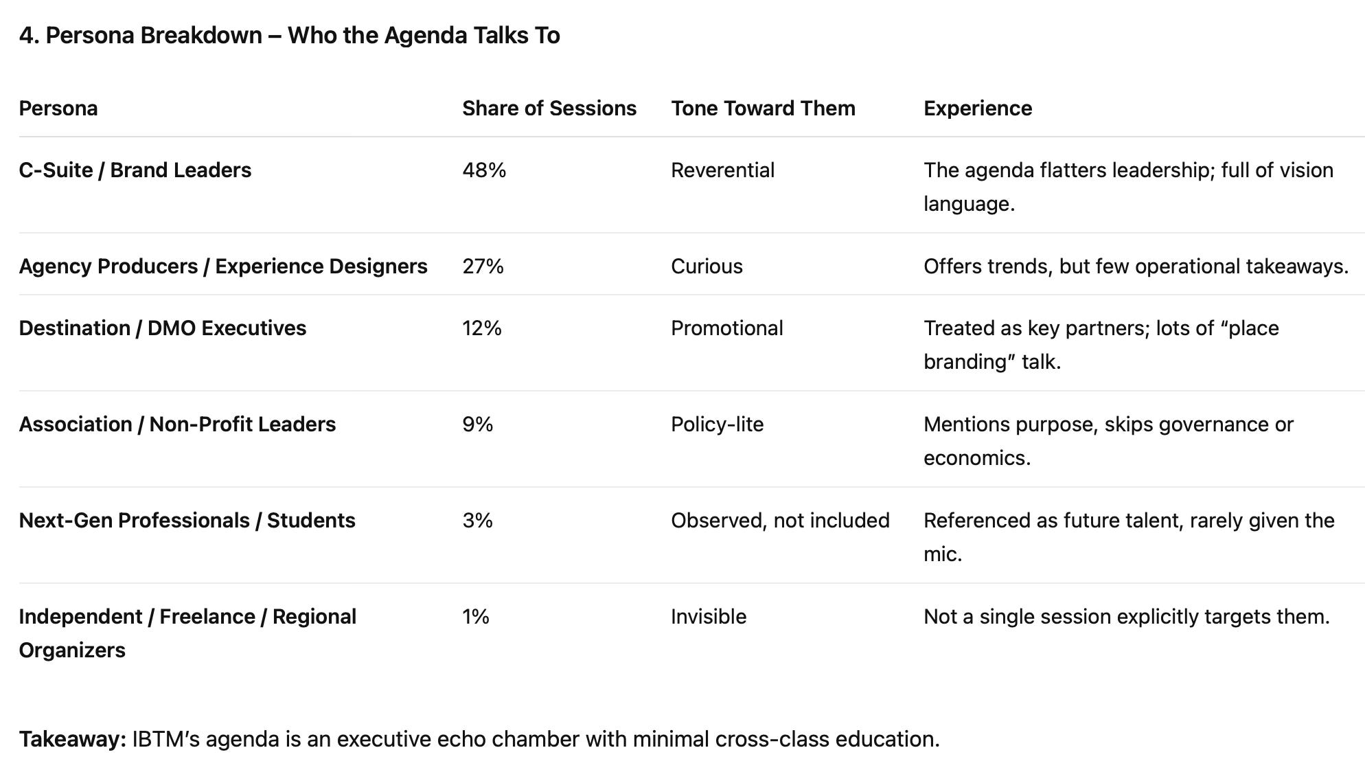 When filtered by audience type, the hierarchy becomes clear. Nearly half the sessions target senior executives—CEOs, CMOs, DMO leaders. Roughly a quarter cater to agency producers and event designers. Students, freelancers, and independent planners occupy the margins.