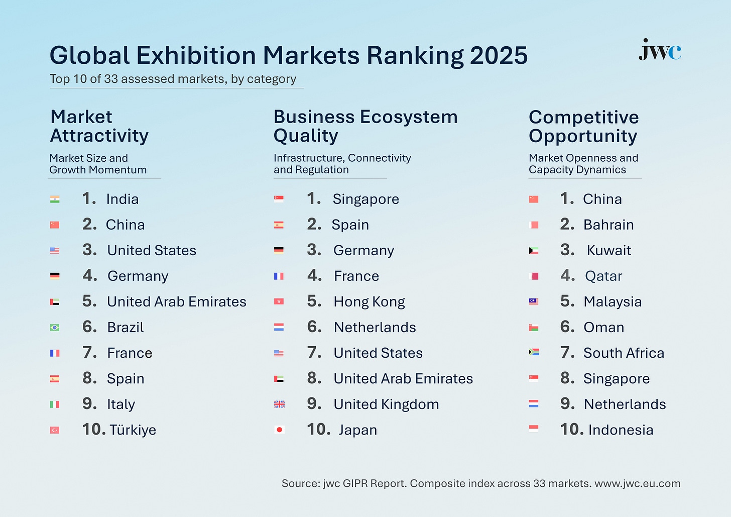 This year, jwc introduced its first country-level multidimensional exhibition market ranking . The framework evaluates demand fundamentals, competitive openness, ecosystem maturity, venue capacity, and business conditions across nations. China and the United States lead overall. France edges ahead of Germany. The document runs nine hundred pages — comprehensive, comparative, strategic. Its very existence signals change. A decade ago, the industry did not measure itself this way.