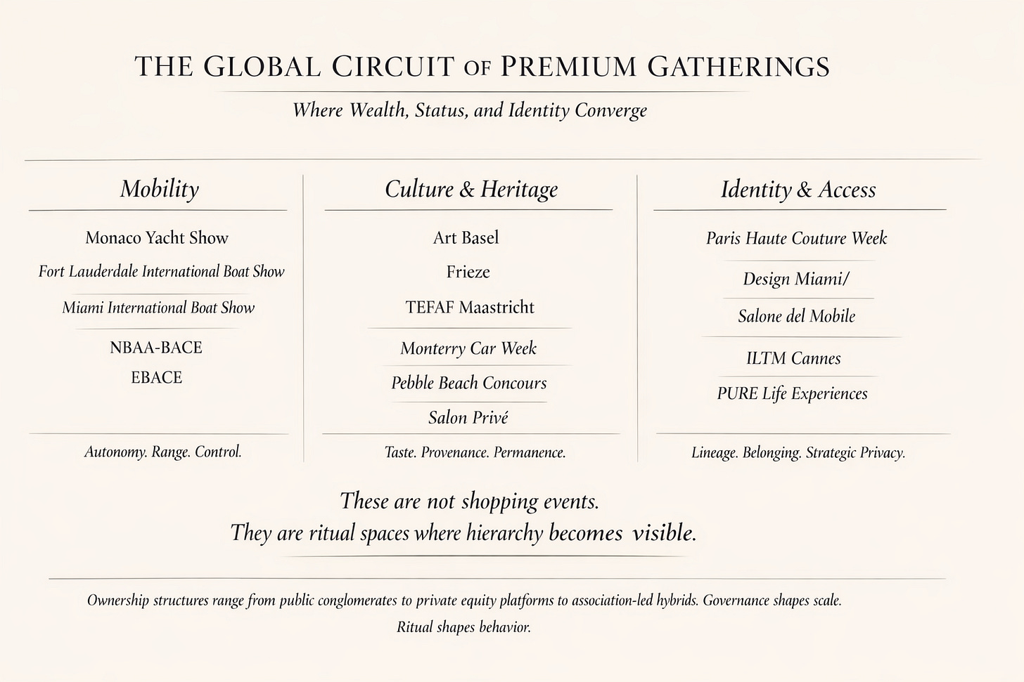 Seen separately, these are luxury events. Seen together, they form a circuit.