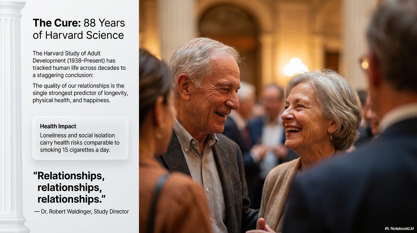 The Harvard Study of Adult Development has been running since 1938. It is the longest in-depth longitudinal study on human life ever conducted, and after nearly nine decades it has arrived at a conclusion simultaneously simple and staggering: good relationships lead to health and happiness. Not wealth. Not genetics. Not the blood-panel regimens Bryan Johnson submits to with the devotion of a medieval monk. Not income, professional success, intelligence, or fame — the quality of our relationships with partners, family, friends, and community is the single strongest predictor of longevity, physical health, and happiness across every social class and generation the study has ever tracked. Dr. Robert Waldinger, the study’s current director, has distilled nearly nine decades of data into three words that deserve to be carved above the entrance of every convention center in America: “Relationships, relationships, relationships.”