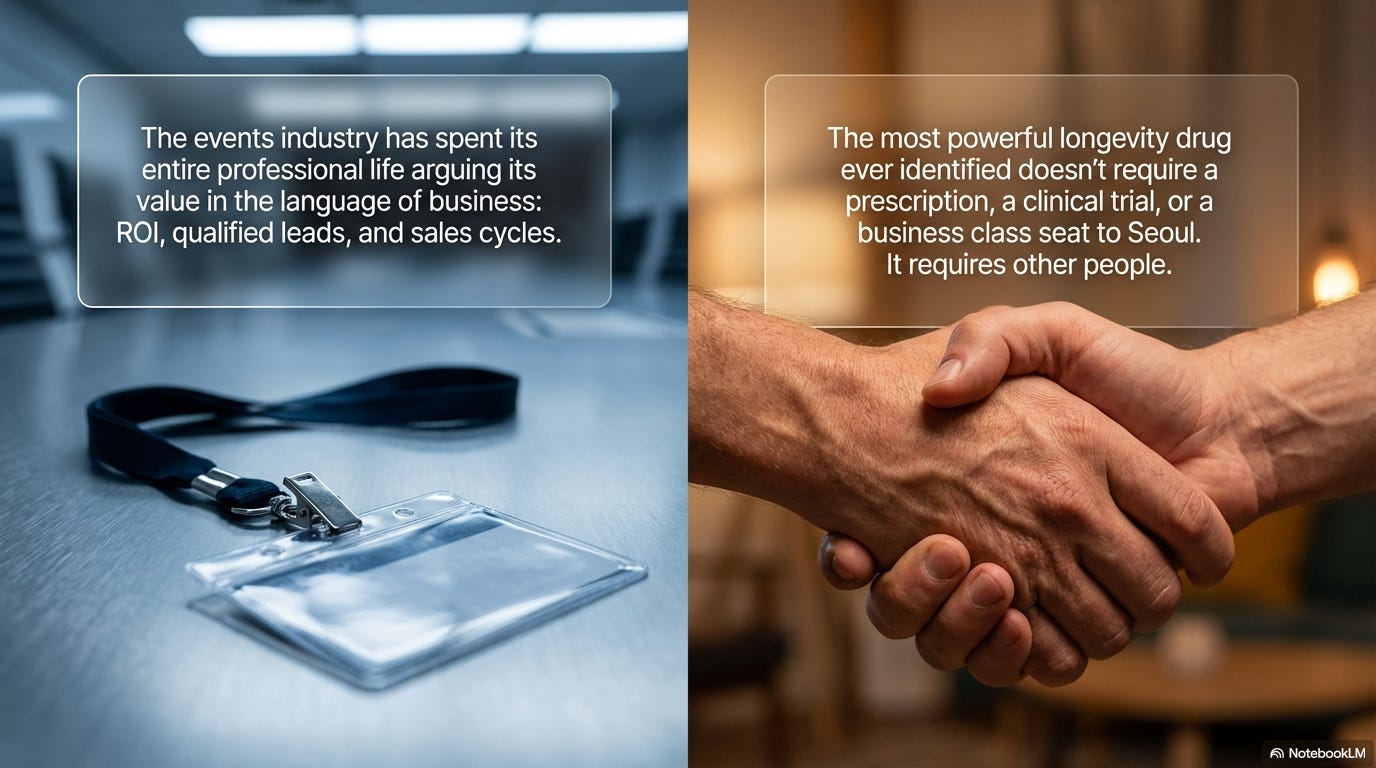 The events industry has spent its entire professional life arguing its own value in the language of business — ROI, qualified leads, sales cycles shortened by a handshake. What it has never done is make the biological case. The most powerful longevity drug ever identified doesn’t require a prescription, a clinical trial, or a business class seat to Seoul. It requires other people. And this industry has been dispensing it, at scale, without credit, for as long as people have been putting chairs in rooms.