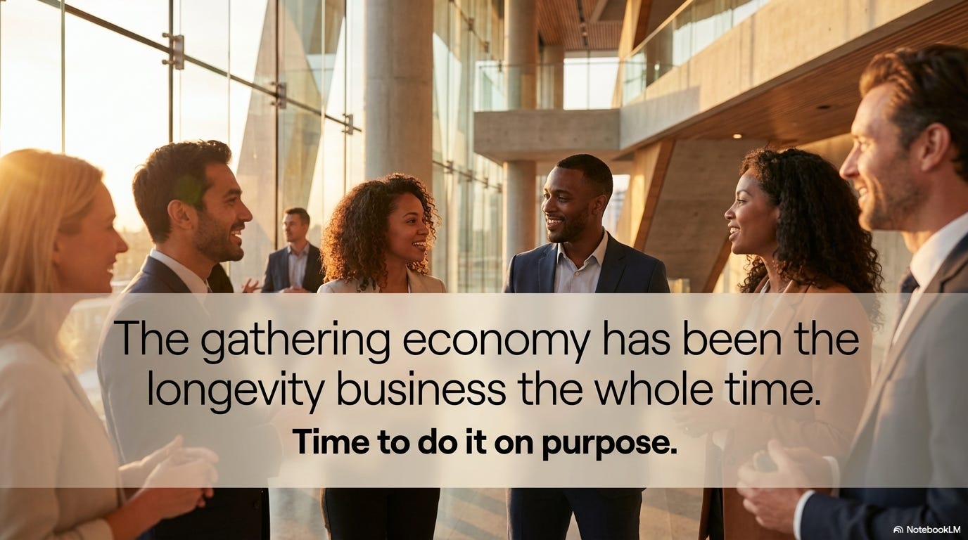 Fueled by the early death of her father and her own serious health scare, Swisher set out to investigate a longevity space she says has been held hostage by “rich tech bros, jacked dude influencers, nonsense sellers of useless supplements.” Her six-part CNN series, premiering April 11, takes her from concierge medical clinics to biotech labs and into South Korea, examining how wealth, access to healthcare, and social connection together determine who actually benefits from the longevity revolution. Sam Altman, Bryan Johnson, Jennifer Doudna, Scott Galloway — the guest list signals that this is not wellness television. It is a reckoning. And the variable that keeps surfacing — the one that resists every optimization scheme, that cannot be purchased at any price point, that no AI can manufacture — is human connection. The biotech crowd can sequence your genome, prescribe metformin, and monitor your VO2 max with Swiss-watch precision. It cannot produce the dinner with old friends, the hallway conversation at a conference that turns into a decade-long collaboration, the wedding toast that reminds a room full of people why they showed up. Those moments belong to the gathering economy. But only when someone in that gathering has made the conscious decision to create the conditions for them.