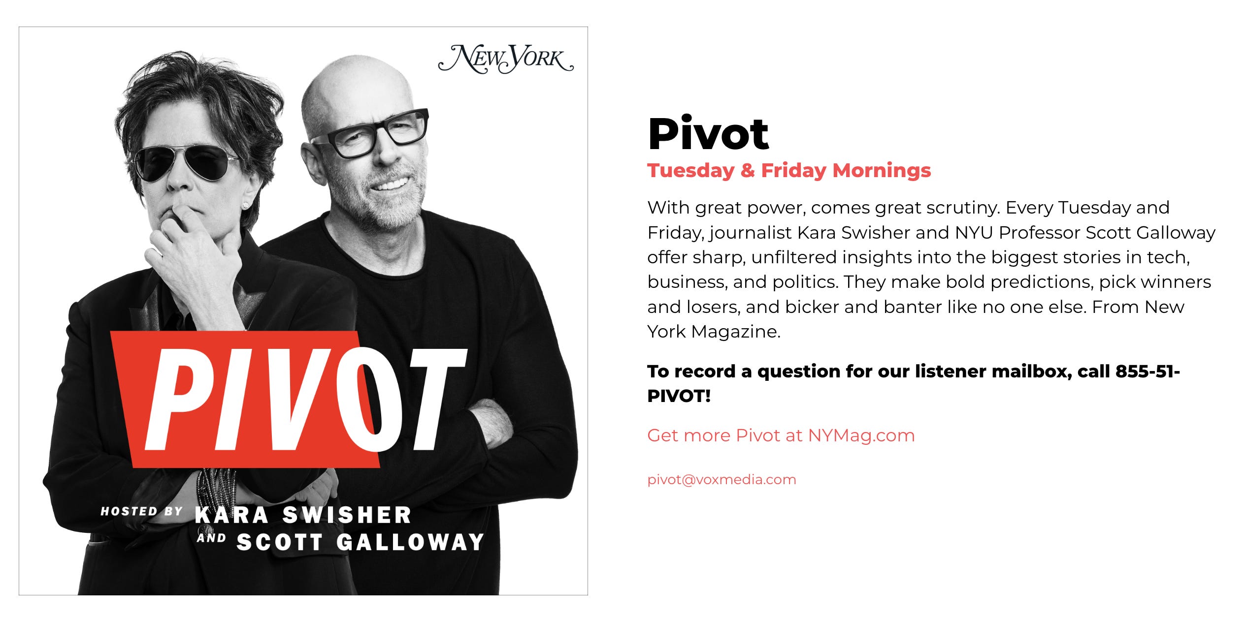 That’s why Pivot matters here. Pivot is a twice-a-week podcast co-hosted by Kara Swisher and Scott Galloway, and on paper it’s “a business and tech news show.” In reality, it’s a relationship you return to. The cadence is dependable. The segments recur. The emotional temperature is consistent enough that listeners don’t have to spend energy learning how to listen. Scott plays provocation with the confidence of someone who knows he’ll be checked; Kara plays precision with the authority of someone who has done this long enough to cut through fluff without losing the room. The friction isn’t chaotic. It’s patterned. That pattern is the point.
