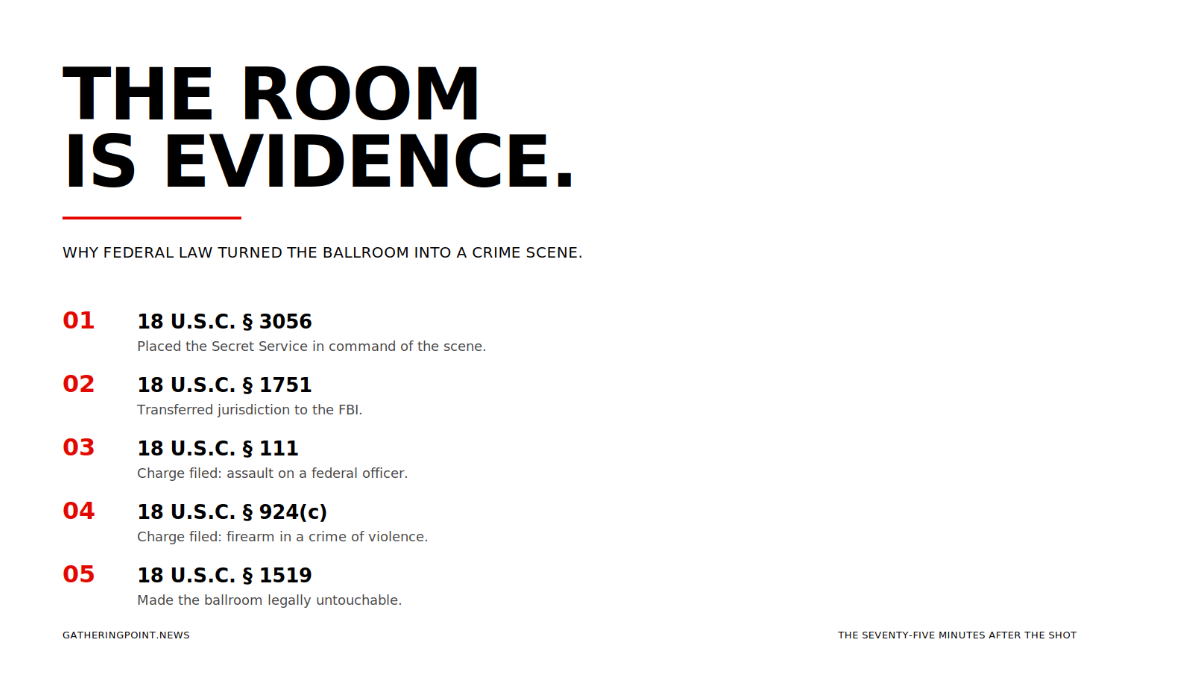 Trump announced from the White House that the dinner would be rescheduled within thirty days. That is a political statement, not an operational one. The rescheduled date will be set by the FBI’s release timeline for the ballroom and the gear inside it, not by the President’s preference. And the rescheduled dinner, whenever it happens, will run on top of a contract stack that was not written for what just happened.