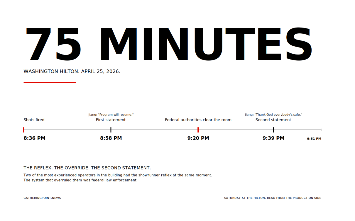 Saturday gave us the case study for how universal the reflex is and how hard the rule is to apply in real time. Twenty-four minutes after the shots, around 8:58, Weijia Jiang — the senior White House correspondent for CBS News and the elected president of the White House Correspondents’ Association, which produces the dinner — returned to the podium and told the room the program would resume momentarily. We don’t have all the details, she said, but we’ll have them shortly. Half an hour later, Trump posted on Truth Social that he had “recommended that we ‘LET THE SHOW GO ON,’” though he would defer to law enforcement. He told reporters at the White House later that he had wanted very much to continue, that he didn’t want sick people and thugs to change the fabric of American life, that the dinner would be rescheduled within thirty days. Two of the most experienced operators in the building on Saturday night had the showrunner reflex at the same moment. The system that overruled them was federal law enforcement, which by 9:20 had begun clearing the ballroom over the host’s stated intention to resume.