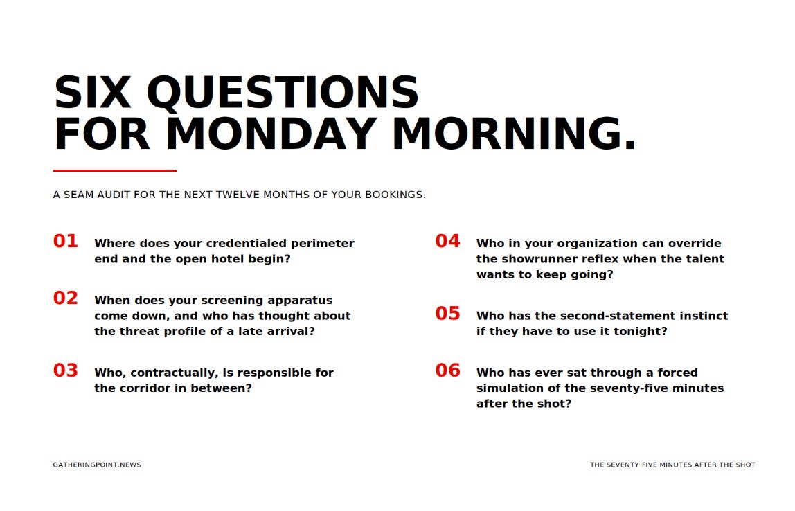 What should be on every organizer’s Monday agenda is not the active-shooter drill. The Secret Service does not need event-industry advice on checkpoints, and most major venues already game out shooter scenarios with varying degrees of seriousness. What needs to go on the agenda is the seam audit. Where, in your next twelve months of confirmed bookings, does the credentialed perimeter end and the open hotel or campus begin. When does your screening apparatus come down, and who has thought about the threat profile of a late arrival. Who, contractually, is responsible for the corridor in between. Who in your organization has the discipline to override the showrunner reflex when the talent wants to keep going, and when you yourself want to keep going. Who has the second-statement instinct if they have to use it tonight. And who in your operation has ever sat through a forced simulation of the seventy-five minutes after the shot, when the protectees are gone, the venue is frozen, the broadcast is dark, the crew is stranded, and the host has ninety seconds to set the tone for everything that follows. That is the room most of us have never been in. After the Hilton, every one of us should be.