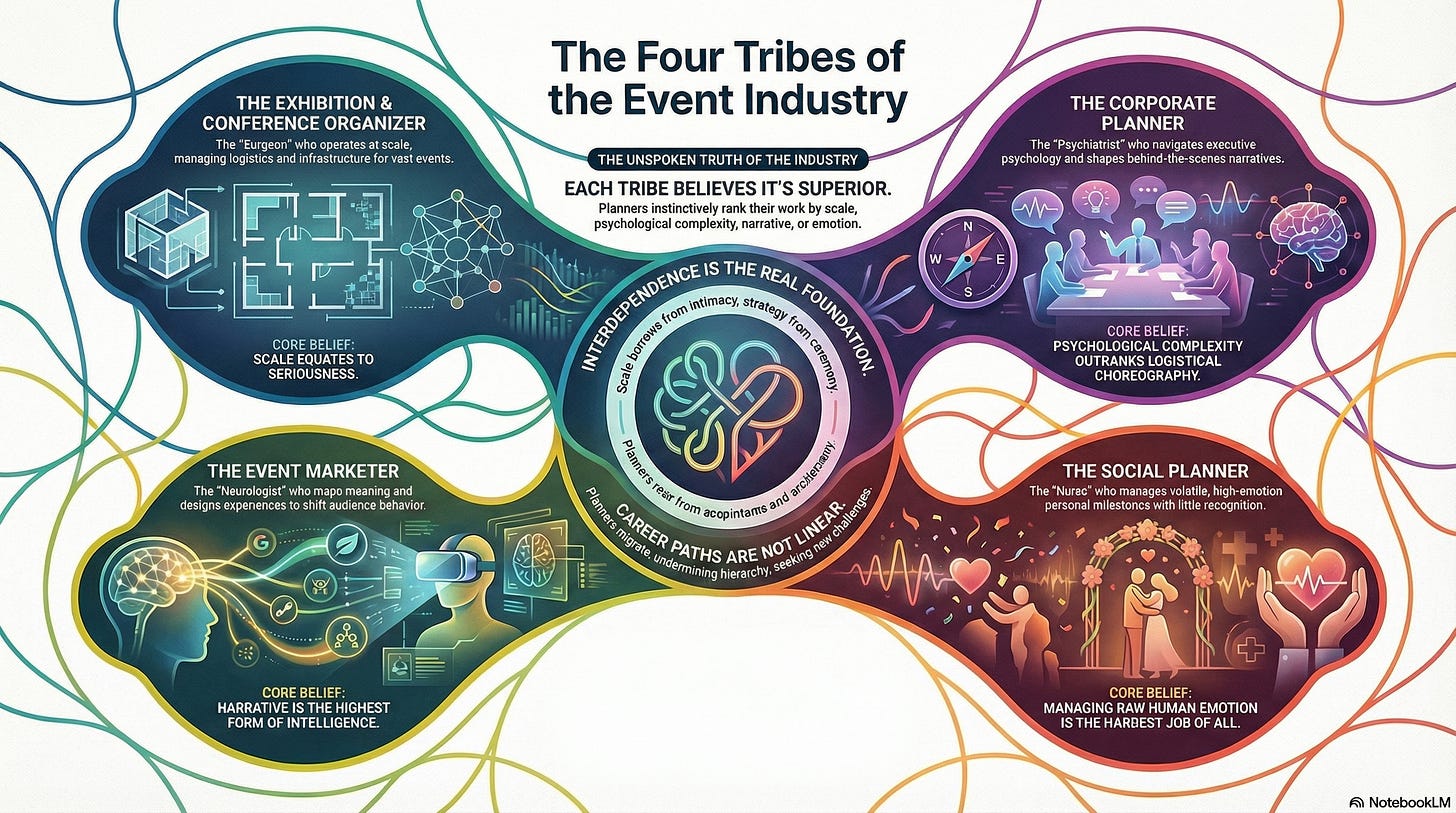 And just when these tribal contours begin to settle into place, another layer reveals itself, one that mirrors the structure of medicine, where specialties carry their own mythologies of superiority and yet rely completely on one another. The Exhibition-and-Conference organizer resembles the surgeon, operating at scale with unapologetic decisiveness. The corporate planner evokes the psychiatrist, diagnosing unseen tensions and orchestrating behavior from inside the mind rather than outside the body. The event marketer moves like the neurologist, mapping meaning and response, translating emotional synapses into strategy. And the social planner stands in the role of the nurse—the indispensable presence closest to the pulse, the one who manages the most volatile human needs with the least cultural recognition. The analogy isn’t perfect, but the resonance is hard to miss: a field that believes its divisions are about skill when they are, in fact, about cultural bias.