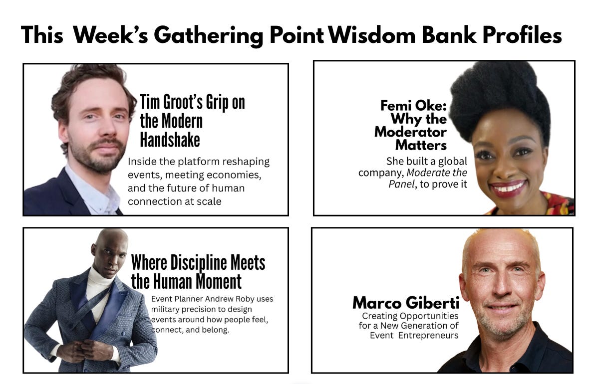 I am trying to build a modern wisdom bank for the gathering economy — a living archive of the practitioners whose thinking the industry will want to draw on for decades, captured while they are still in the room. Four inductees this week. The full profiles live below. Here is why I picked each one.