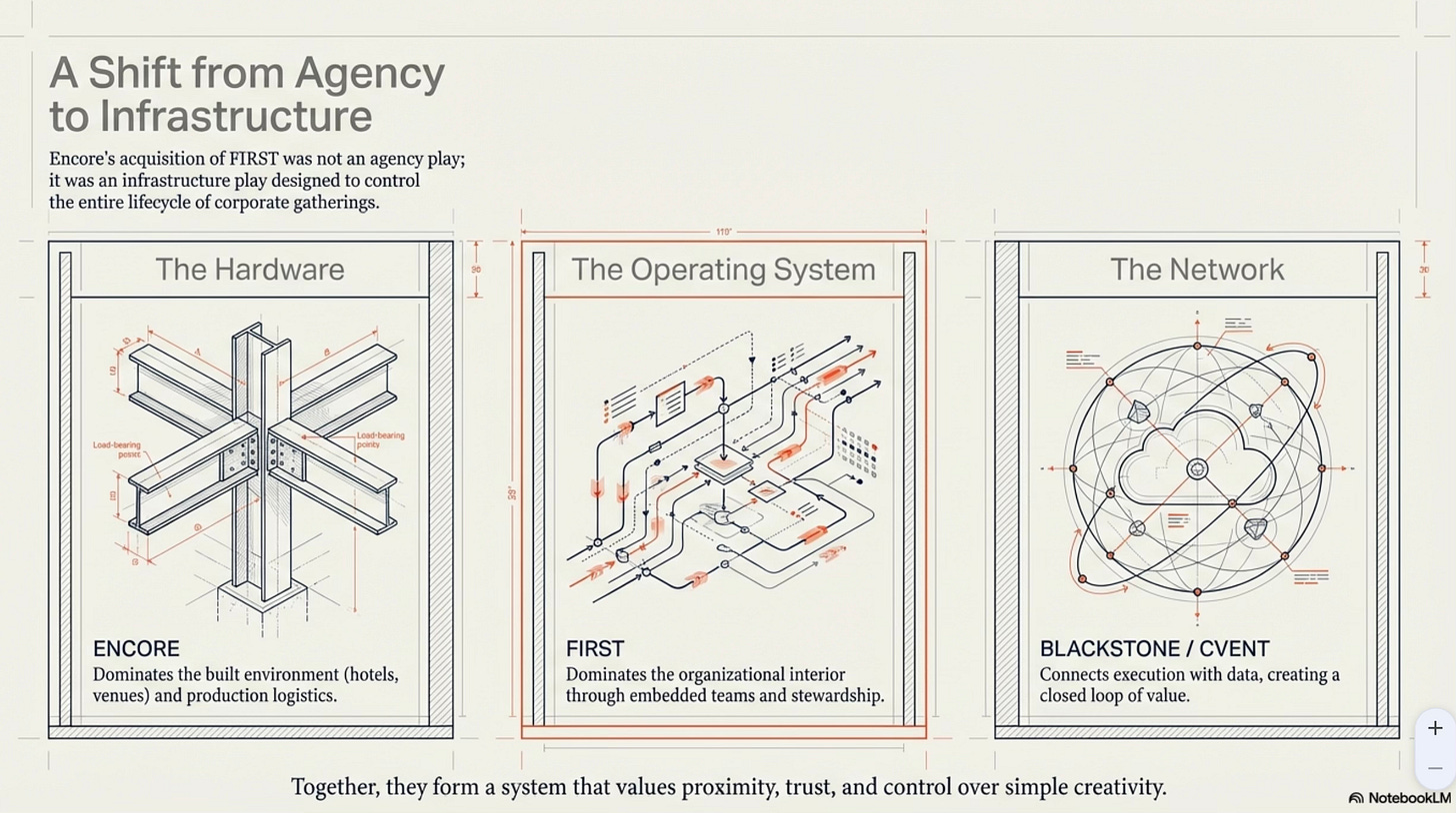 Cvent is not an agency or a production company. It is the system of record. It governs which events get funded, which formats are repeated, and which gatherings justify future investment. Placed alongside Encore’s control of physical execution, FIRST’s embedded presence inside organizations, Clarion’s ownership of convening formats, and Blackstone’s hospitality footprint, Cvent completes the stack. Physical layer. Production layer. Organizational layer. Digital decision layer. Not coordinated in some conspiratorial sense, but aligned around a clear capital thesis: the future value of gatherings lies not in spectacle, but in systems that remember.